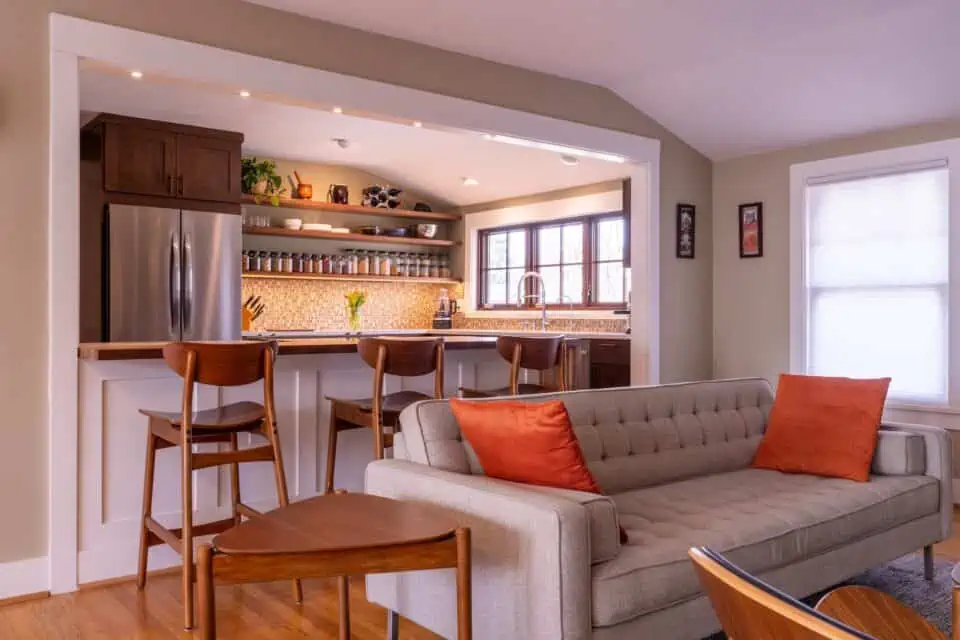 In this project, we worked with an Ithaca homeowner to create a kitchen and living room that are well demarcated but remain connected enough to feel like a single space.
