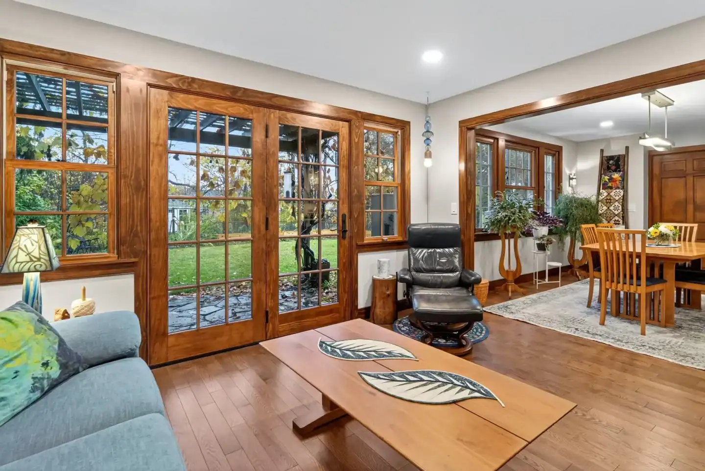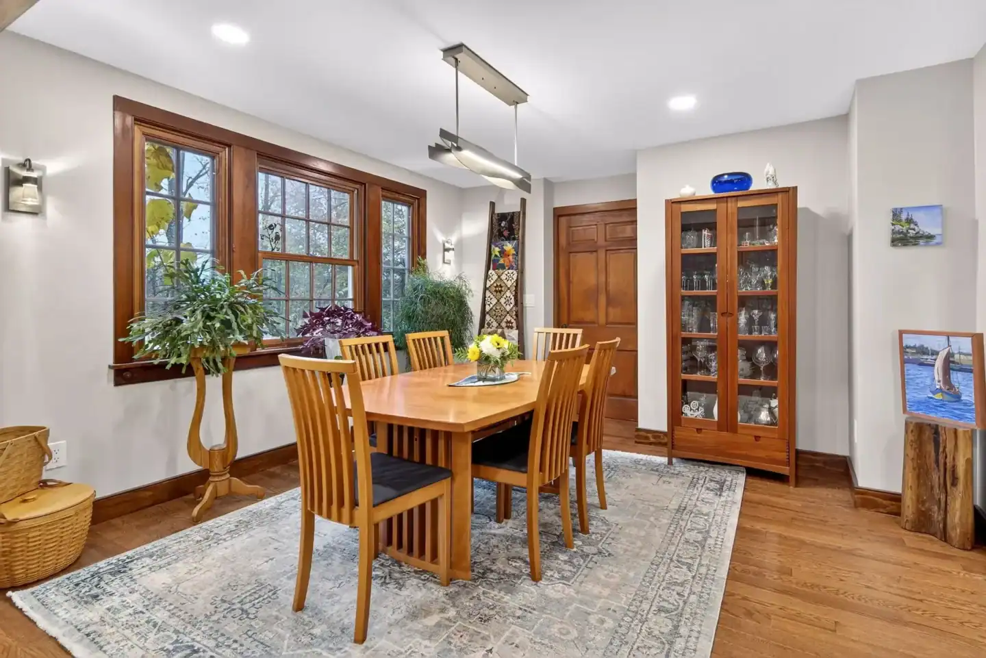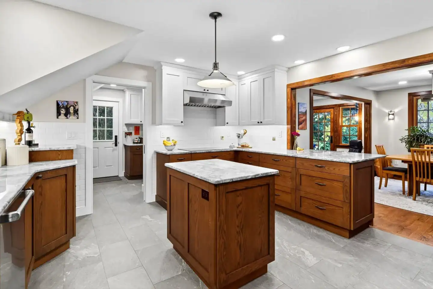 By removing a key wall in the kitchen, we opened the space to the dining area and highlighted a large picture window overlooking the landscaped backyard. This not only enlarged the overall space and brought in abundant natural light, but also reimagined the flow and function of the home. The main-floor laundry relocation, added storage, and open-concept layout combine style, efficiency, and family-friendly living in a bright, inviting space.
