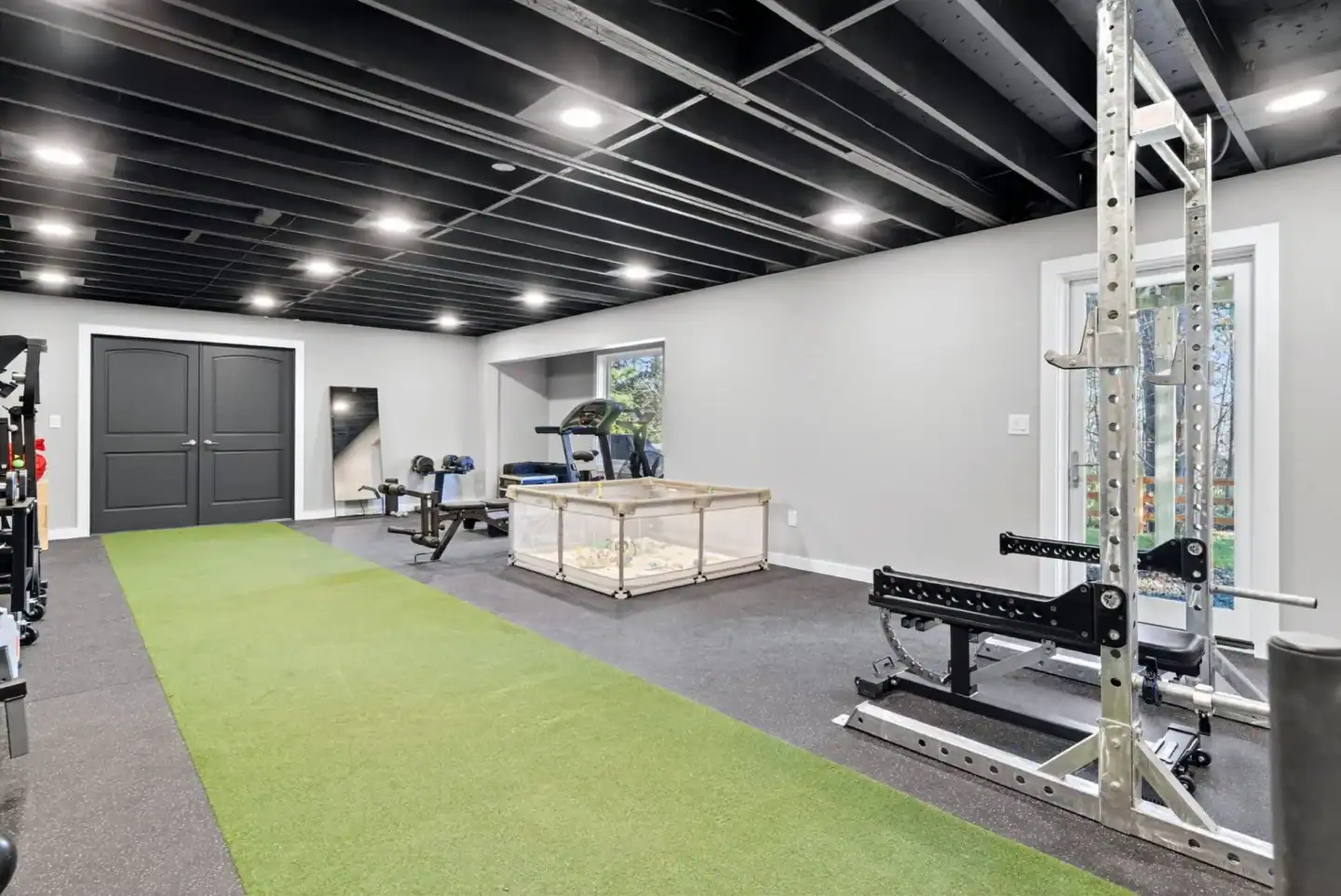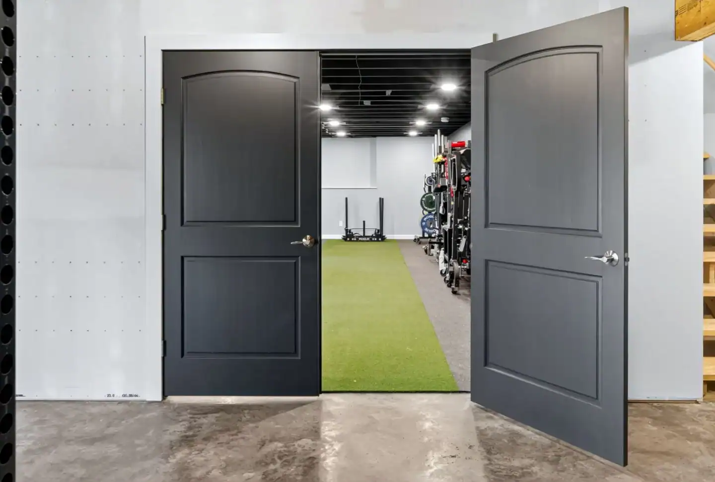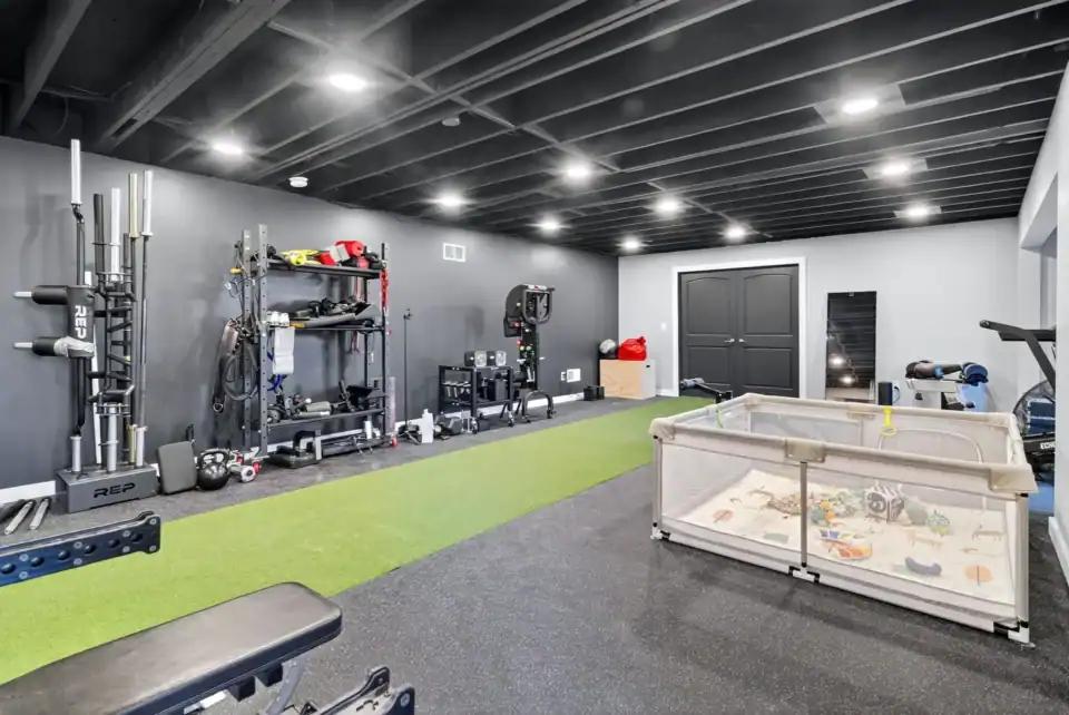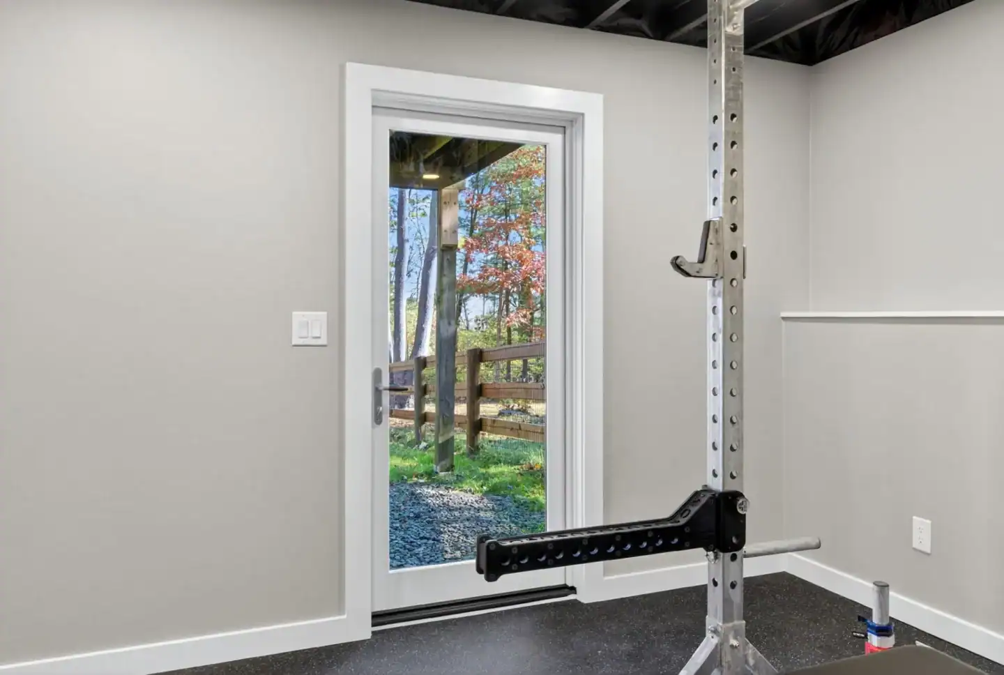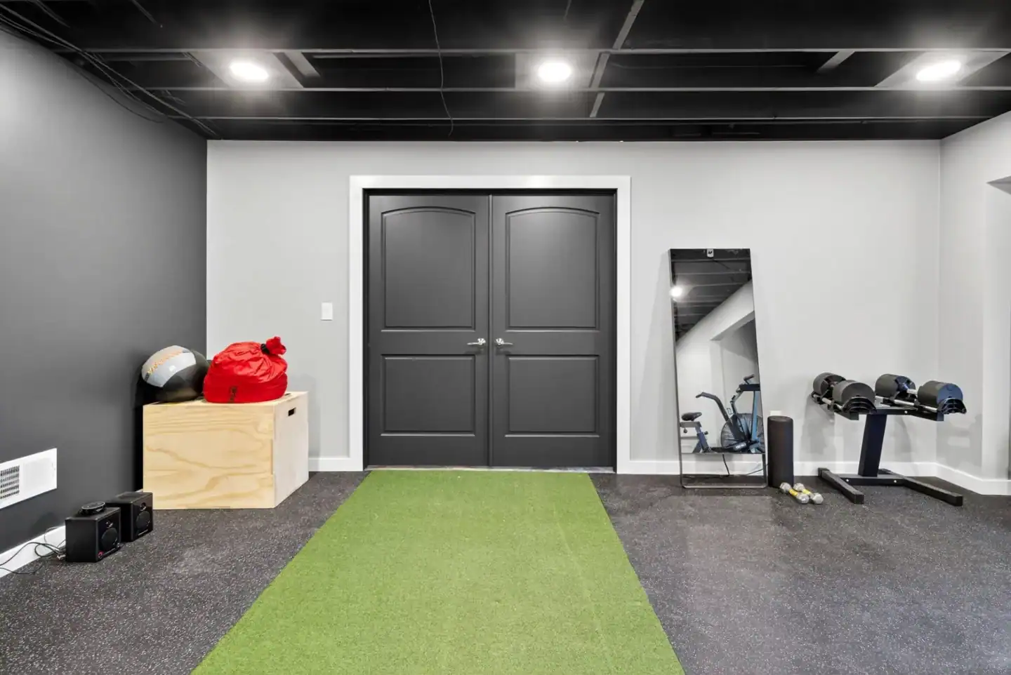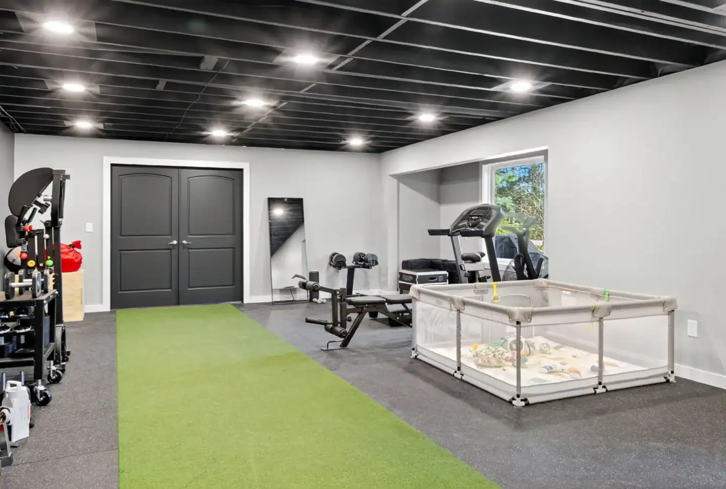 We brought the vision to life with French doors, abundant natural light, and direct access to the outdoors. Thoughtfully designed for the whole family, the room even accommodates their son’s playpen, allowing everyone to enjoy the space at the same time. The result is a bright, functional, and stylish home gym that perfectly balances exercise, family living, and design.