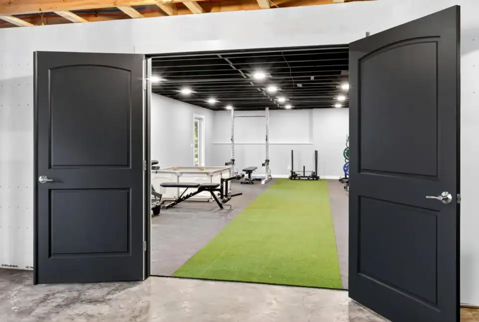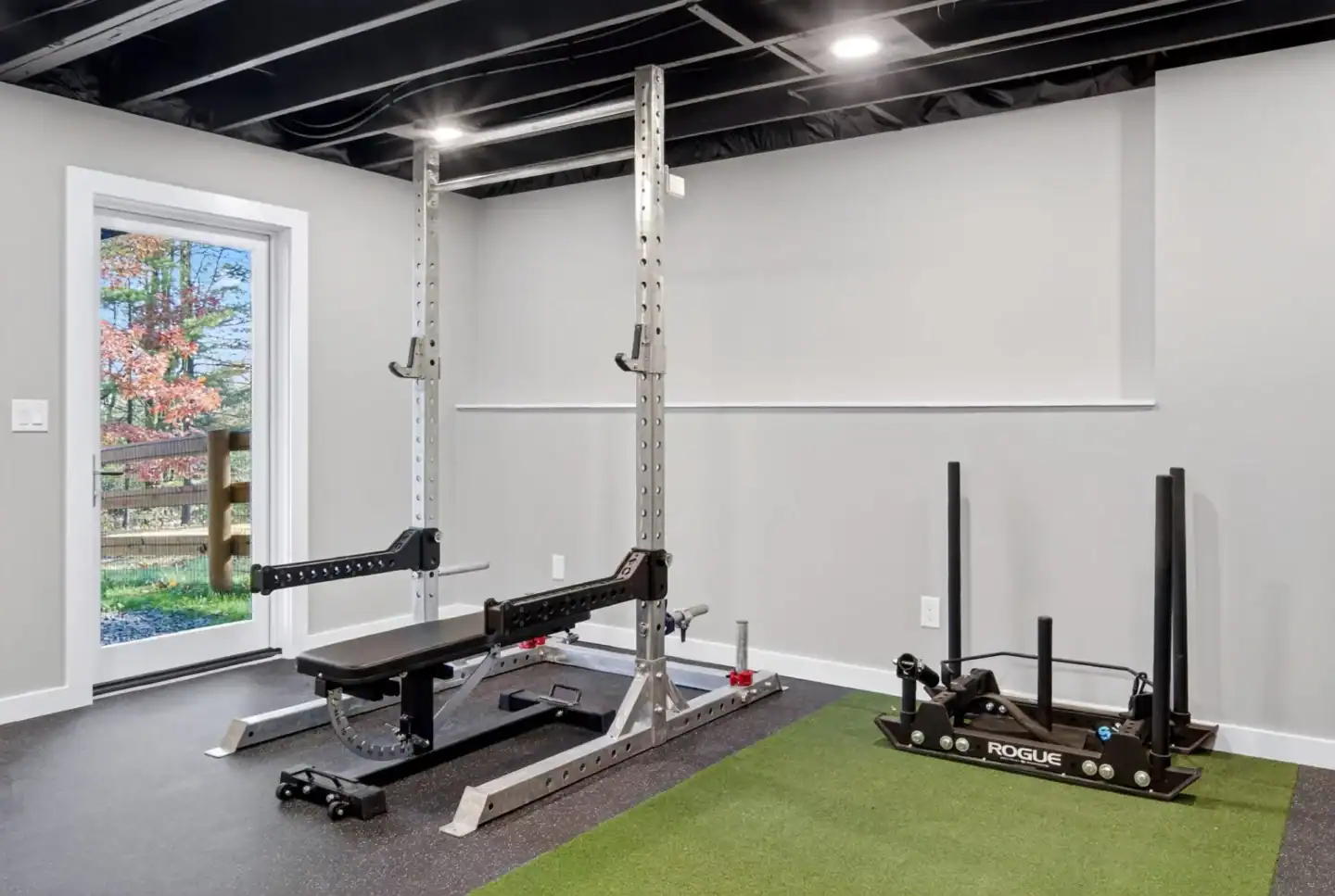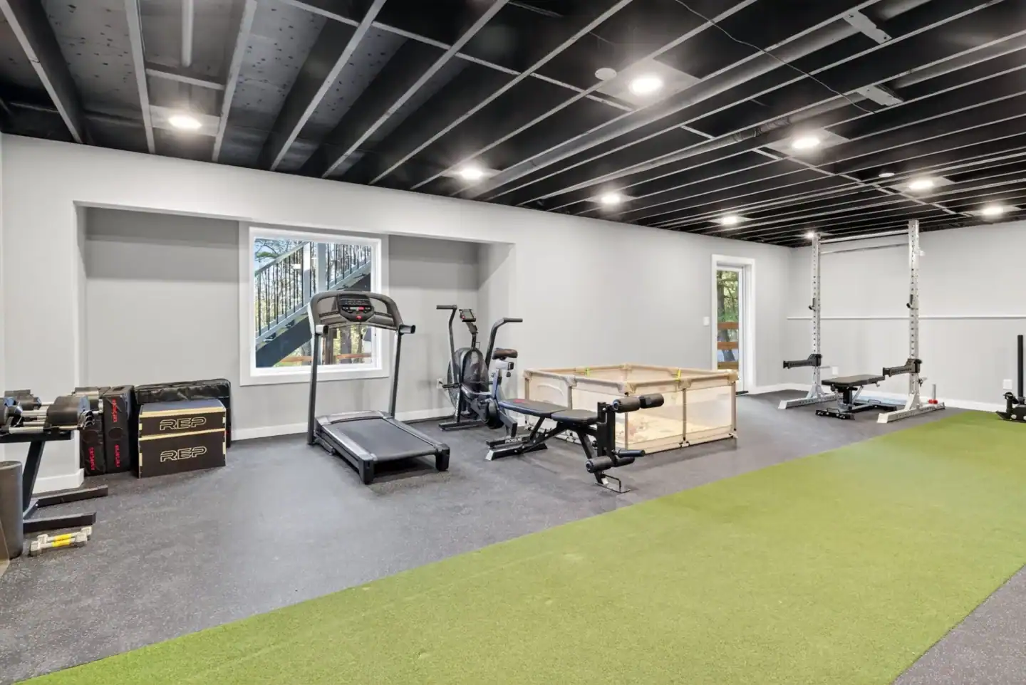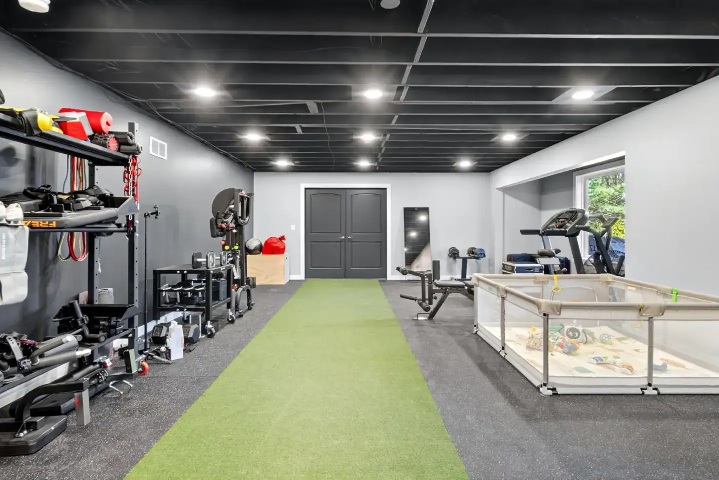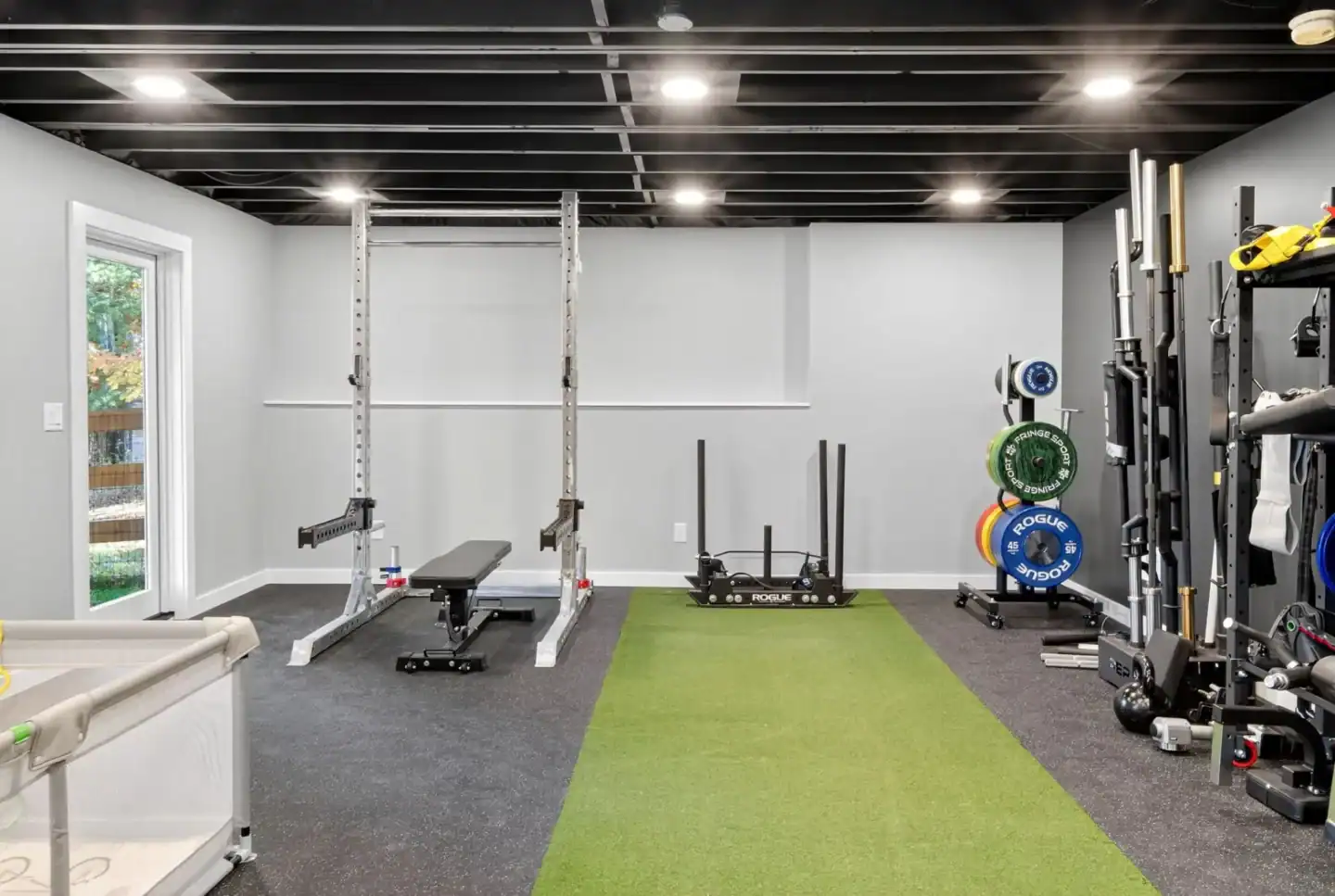 We brought the vision to life with French doors, abundant natural light, and direct access to the outdoors. Thoughtfully designed for the whole family, the room even accommodates their son’s playpen, allowing everyone to enjoy the space at the same time. The result is a bright, functional, and stylish home gym that perfectly balances exercise, family living, and design.