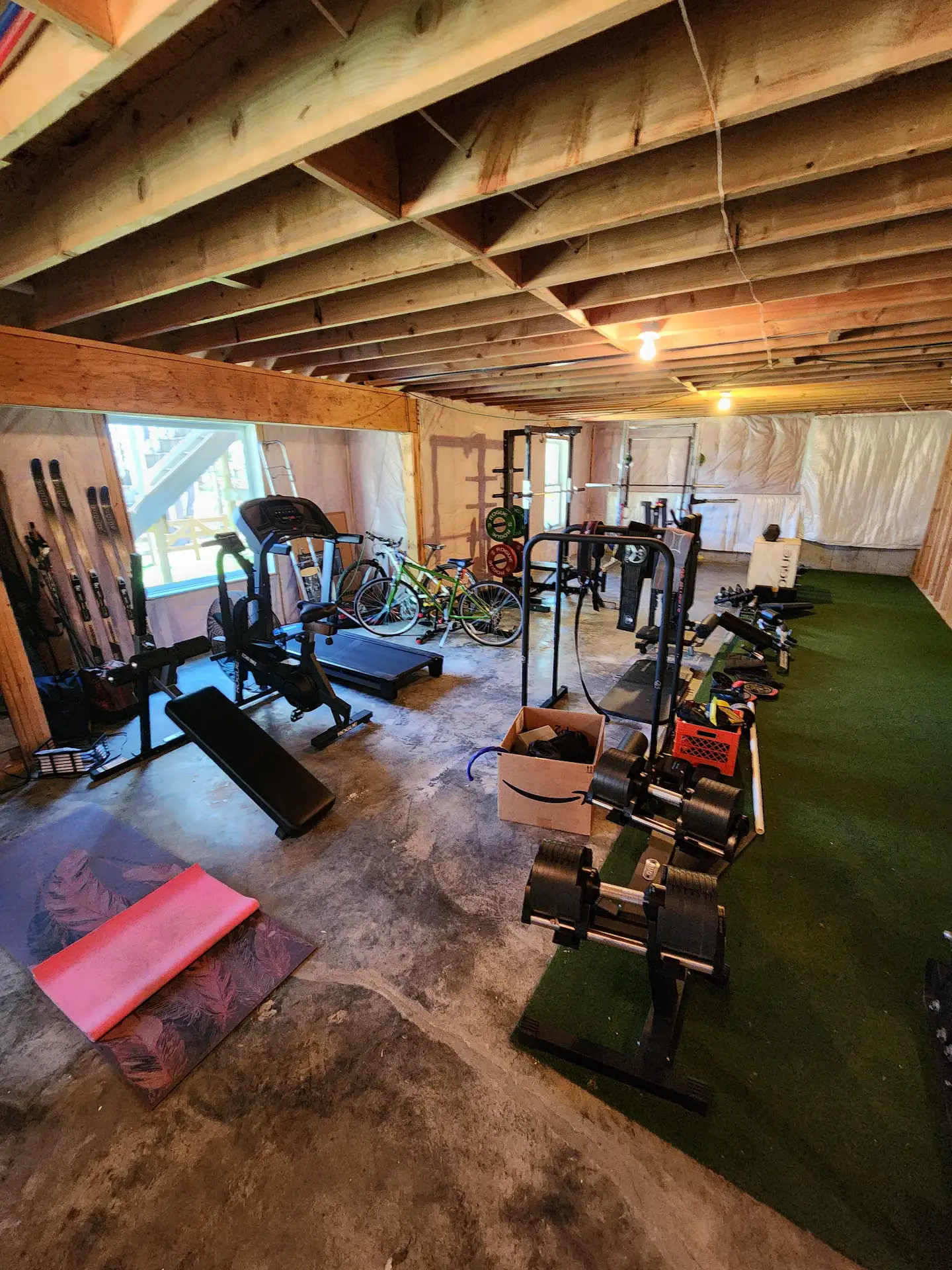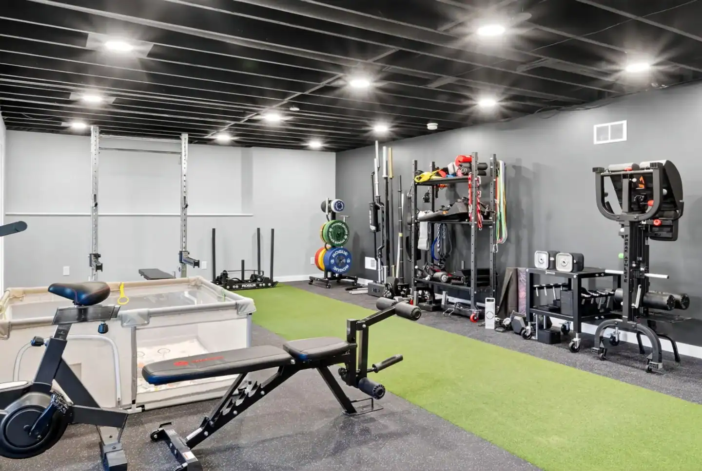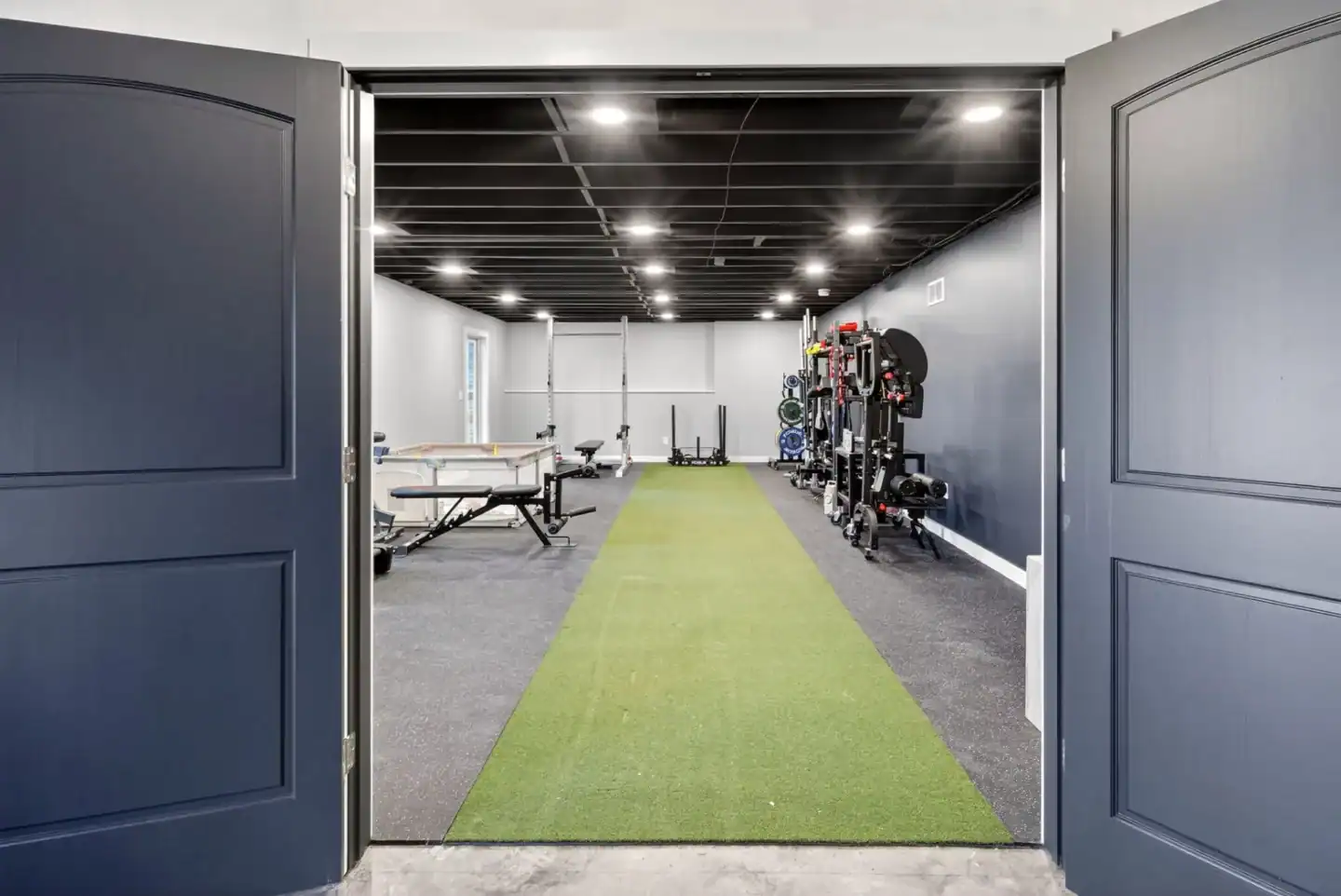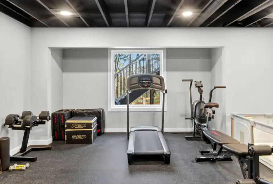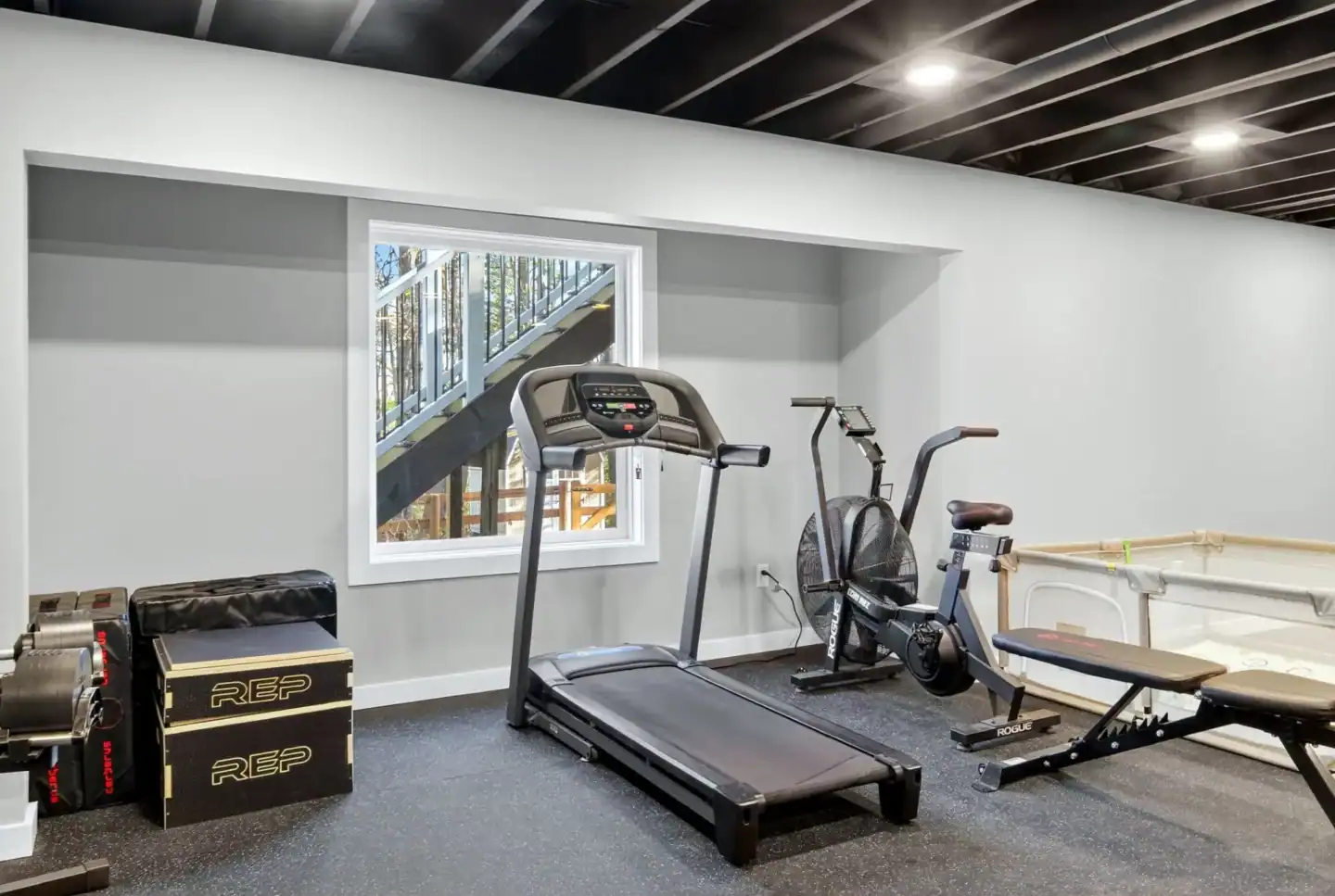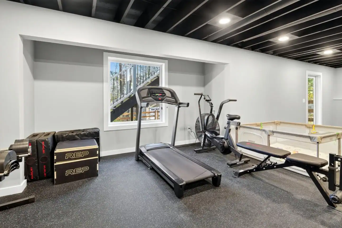 We brought the vision to life with French doors, abundant natural light, and direct access to the outdoors. Thoughtfully designed for the whole family, the room even accommodates their son’s playpen, allowing everyone to enjoy the space at the same time. The result is a bright, functional, and stylish home gym that perfectly balances exercise, family living, and design.